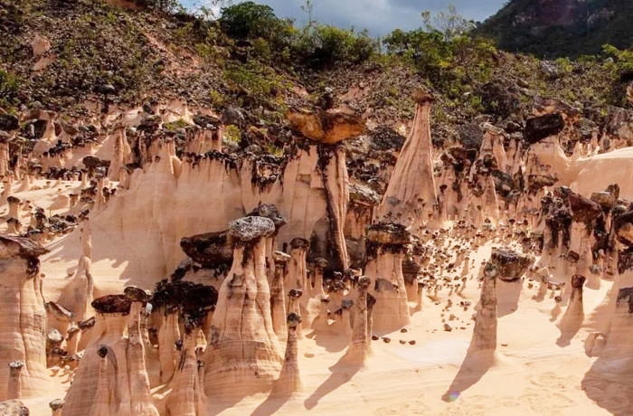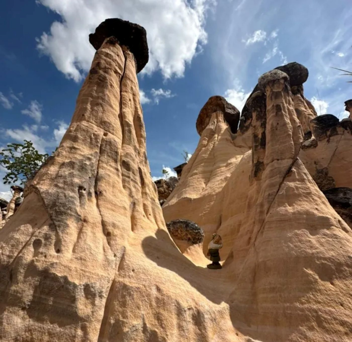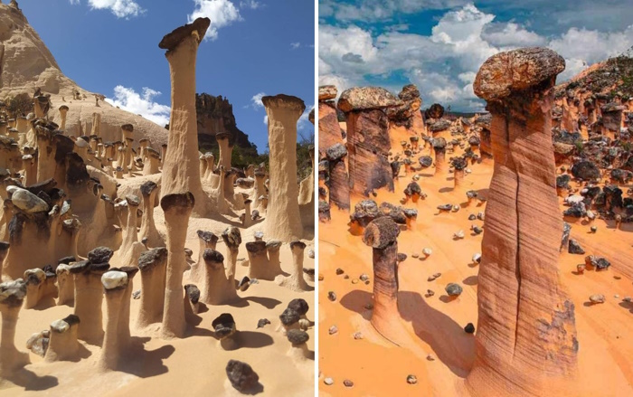 Ao longo do tempo, uma rocha mais dura acabava depositada sobre outra mais frágil, que erode facilmente. A ação da chuva e do vento retira os sedimentos que se acumularam em torno das rochas mais consistentes, mantendo a parte que fica sob cada bloco, que funciona como um chapéu de proteção. “Temos a impressão de que as torres se ergueram, mas foi o entorno delas que cedeu”, conclui a geóloga.